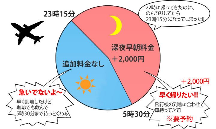 飛行機到着が22時であっても、お車のお返しが23時15分を過ぎた場合は2,000円の追加料金が必要になります。