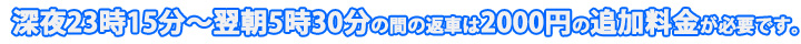・深夜23時15分以降の返車の場合も早朝と同じく追加料金が必要となります。